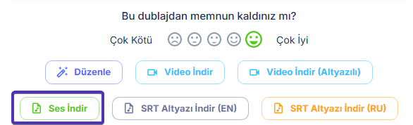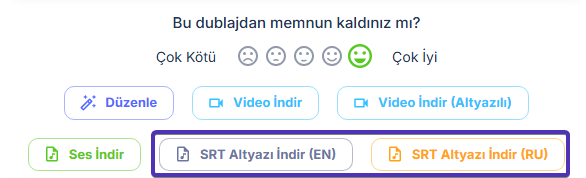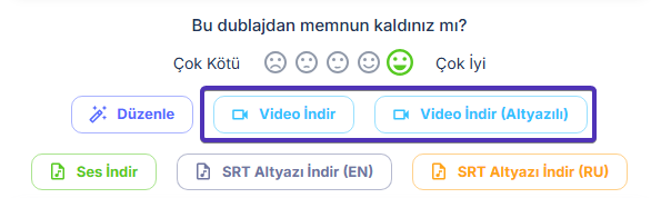 If you selected the "Generate Subtitled Video" option when creating your dubbing, you can download your subtitled dubbing video by clicking the "Download Video (Subtitled)" button. You can immediately download your non-subtitled dubbing with the "Download Video" button: