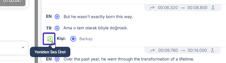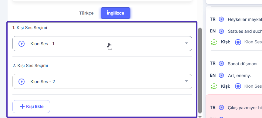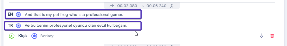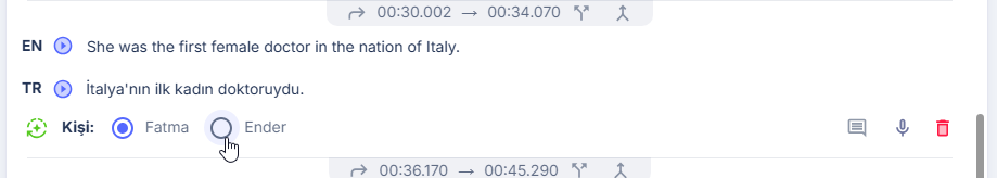 "Person": from here you can choose from the person voices in your dubbing and determine who will voice a sentence in the video stream.