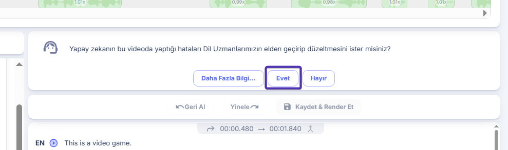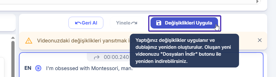 You must click the "Apply Changes" button for the changes you make to your video dubbing project to be saved and your project to be reprocessed and prepared.