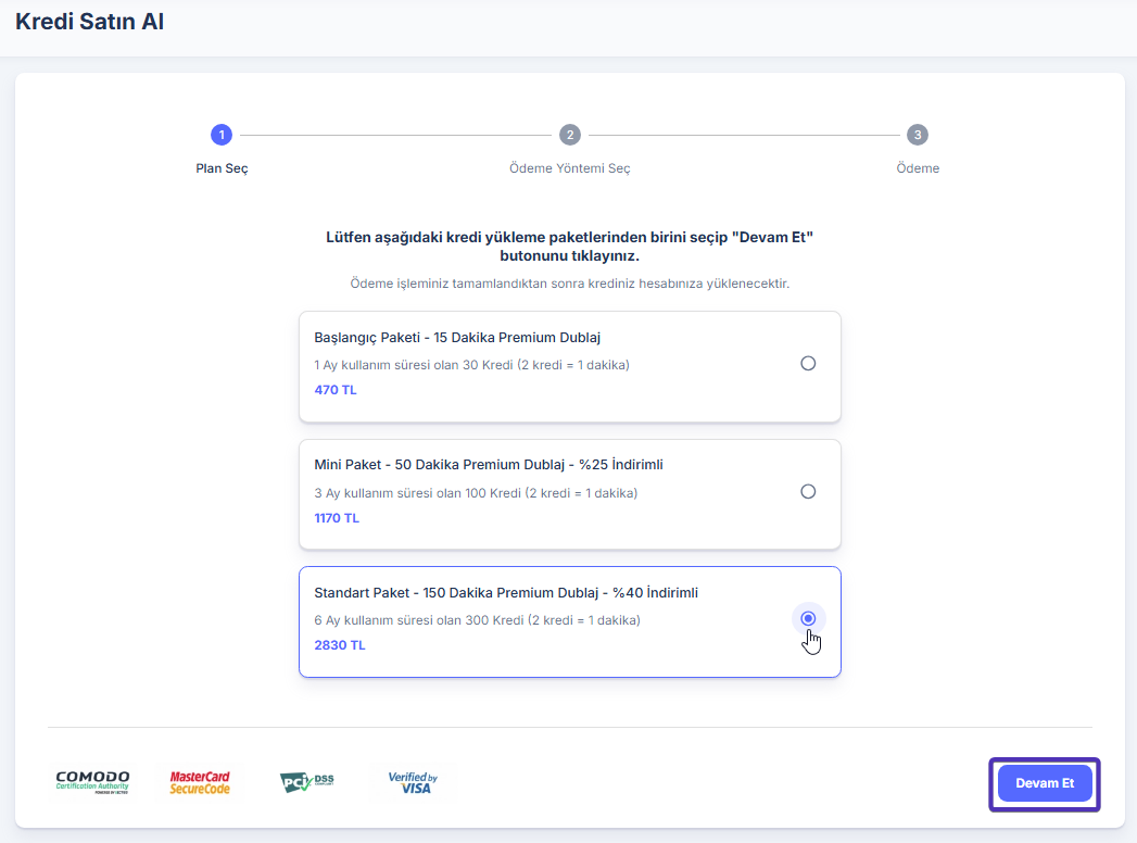 In the first step you will see the credit loading packages you can choose from, you can select a package suitable for your dubbing needs and click the "Continue" button: