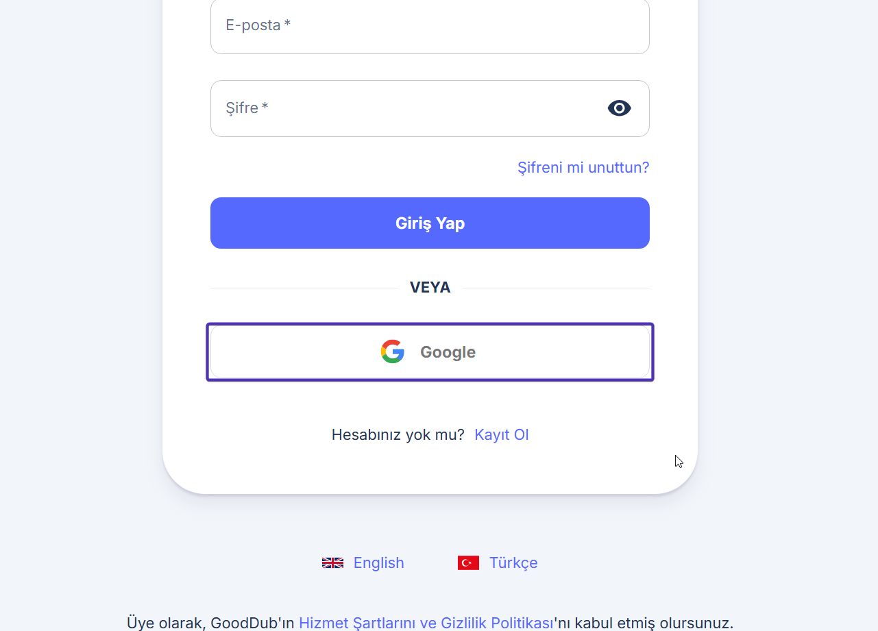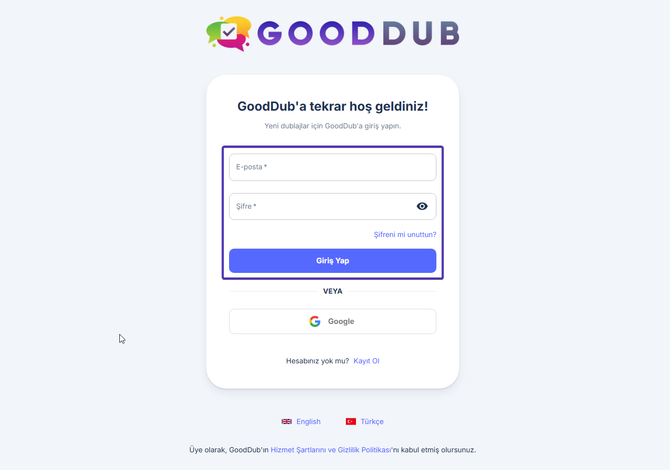 Start your AI dubbing projects with GoodDub right away! Creating a trial membership that you can use for free is very easy. You can quickly create your account with email or Google.