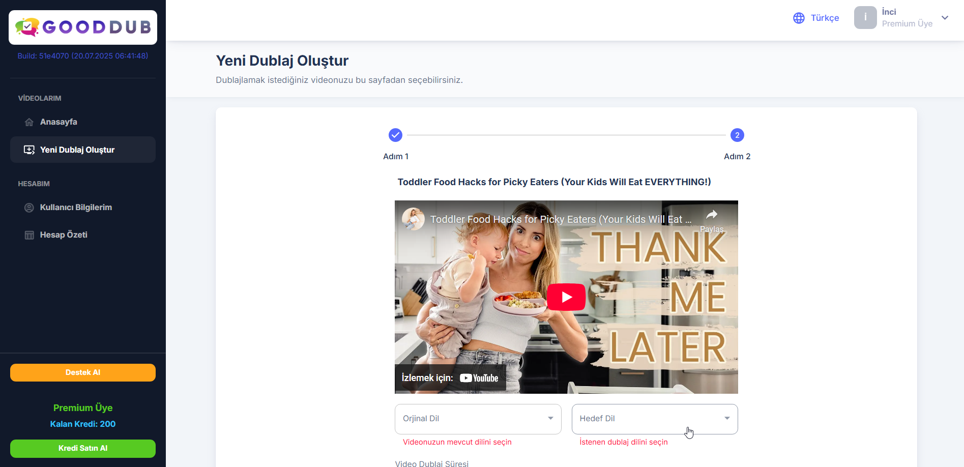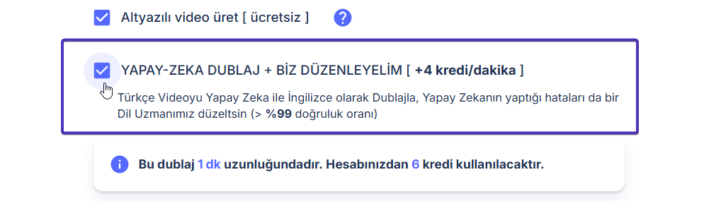 By selecting this feature, you can get language expert service. Or you can leave this selection empty and recreate your dubbing by making your own edits on the Watch/Edit Dubbing page after AI translation.